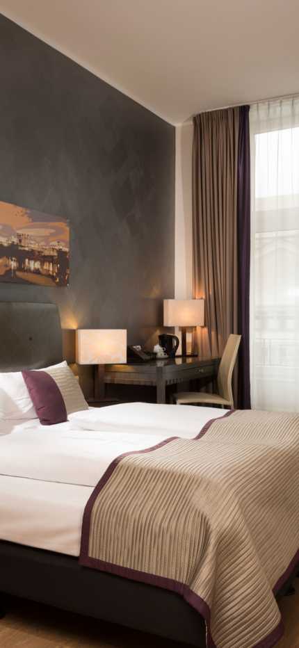Das Vier-Sterne-Hotel hält für seine Besucher insgesamt 109 Gästezimmer in drei unterschiedlichen Größen bereit, die je nach Kategorie zwischen 10m² als Standardzimmer und 51m² als Junior Suite messen.