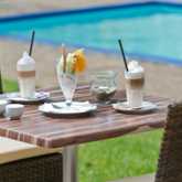 It has its own garden terrace that seats a further 52 people, a sunbathing lawn and an outdoor swimming pool. Drinks and snacks are also served to the lawn and the pool.