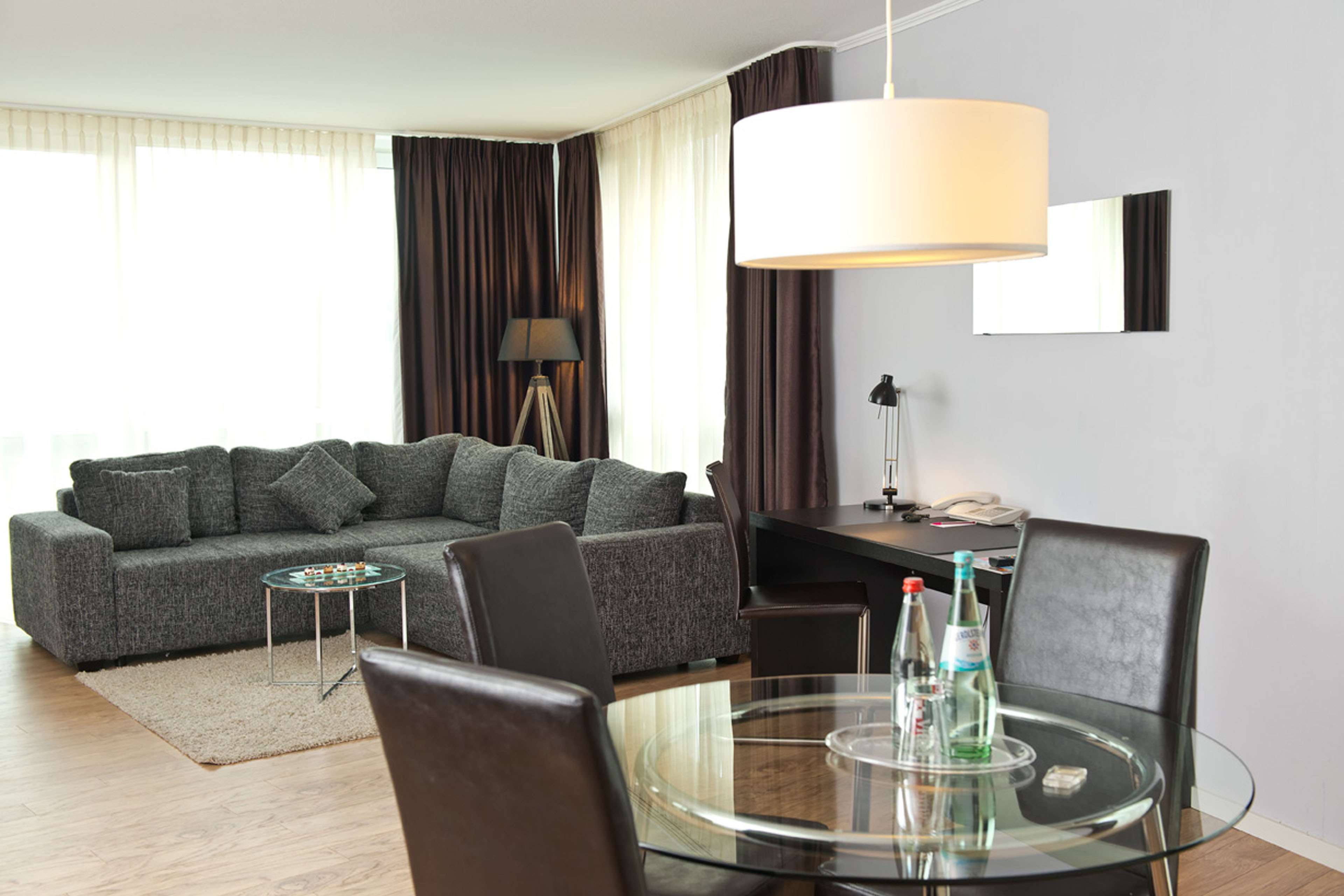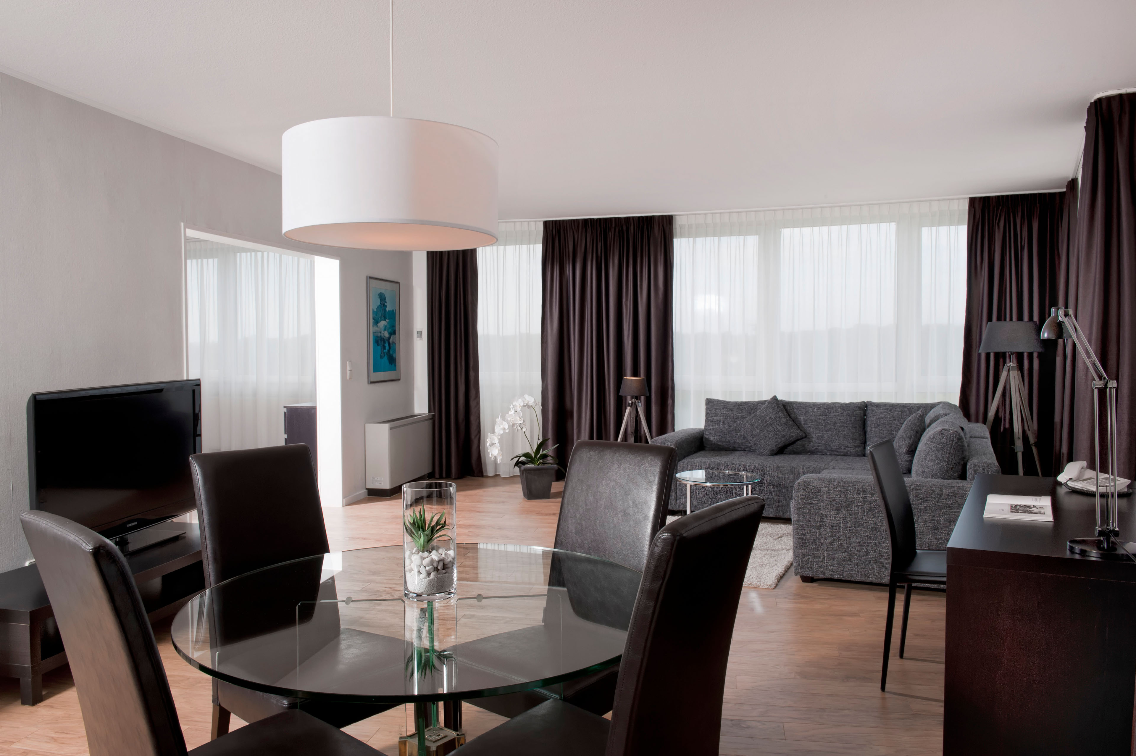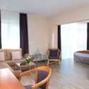 The living area includes a work desk with a telephone, cable TV and internet connection. The apartments are approx. 55 m² in size and feature separate sleeping and living areas, some of them a kitchenette and a dining table.