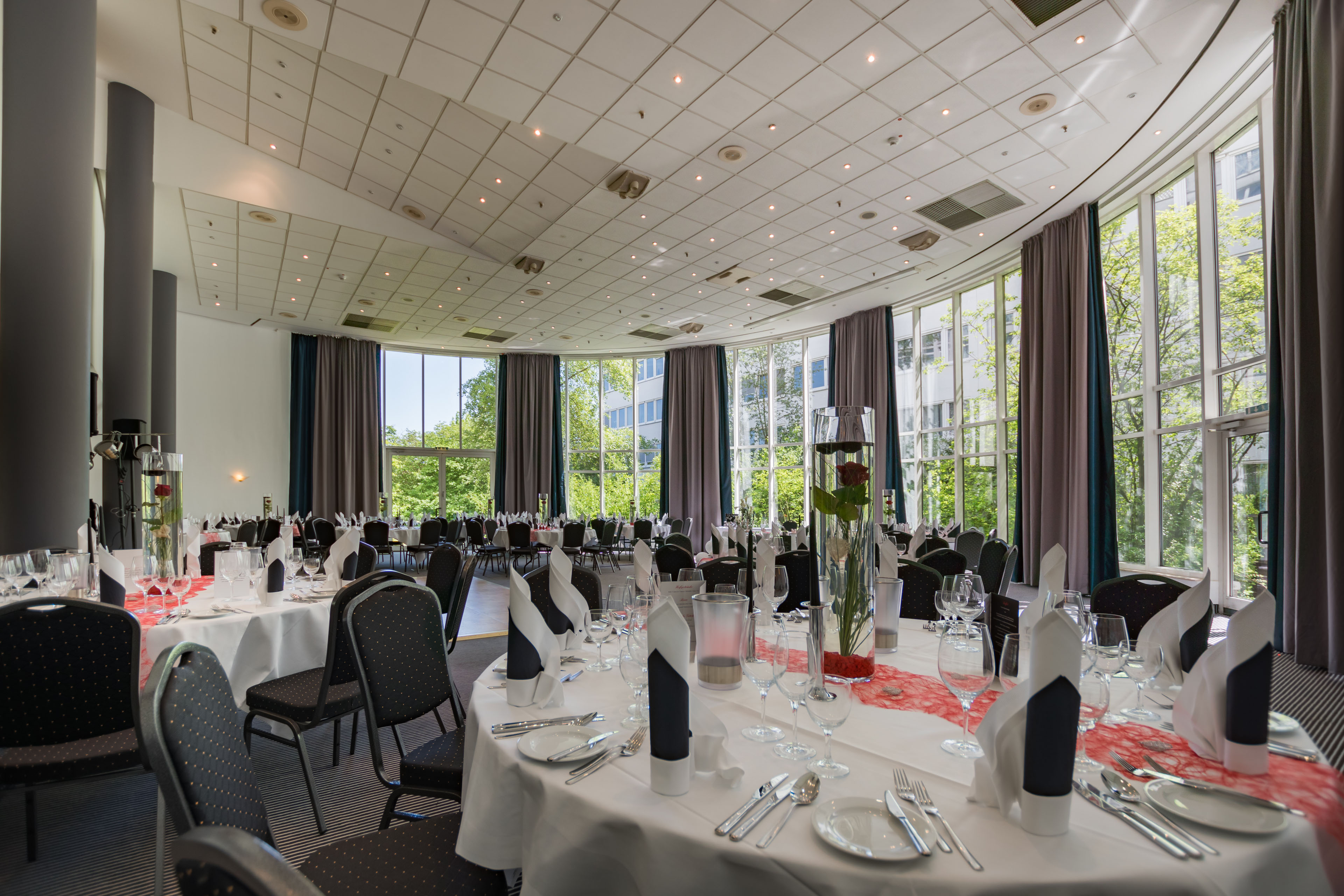 As a conference and event hotel, the Wyndham Hannover Atrium Hotel offers a total of 13 function rooms equipped with the latest conference and presentation technology. All rooms offer natural daylight and dimming option. The pavillon with its circle-shaped glass facade is a very unique venue and particularly convenient for automotive presentations.